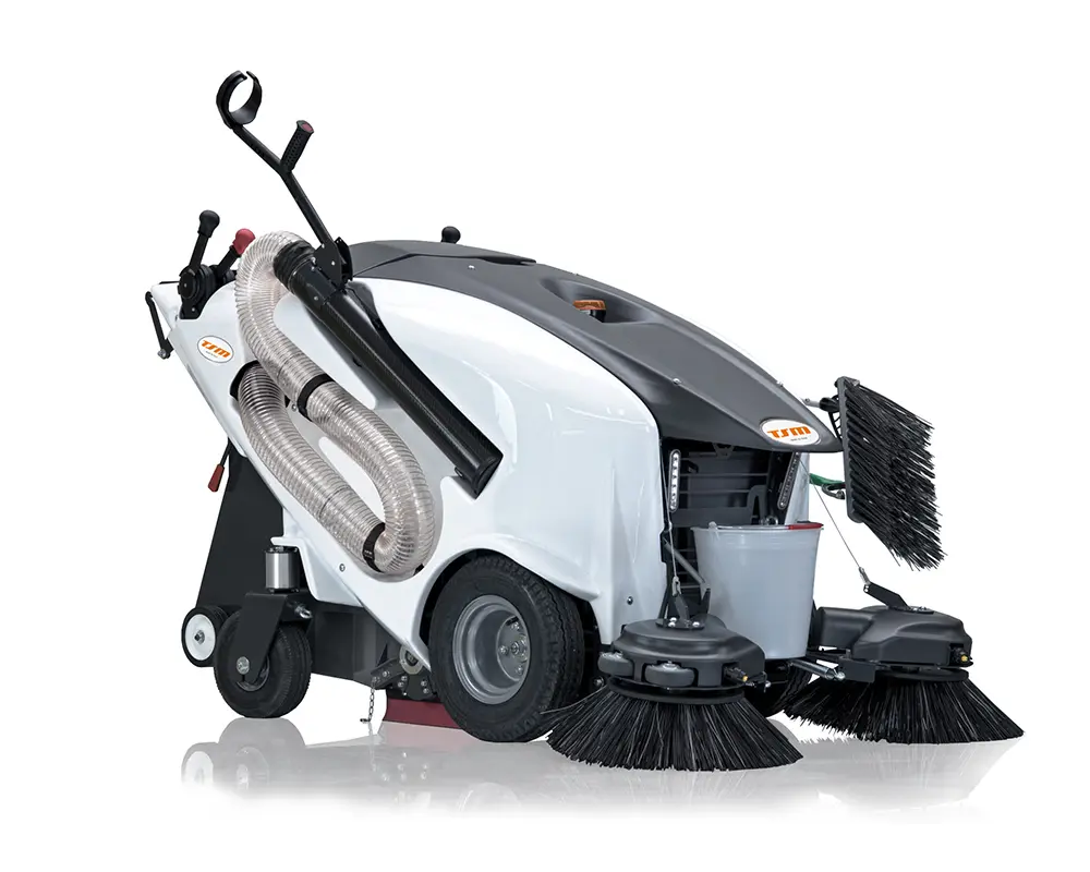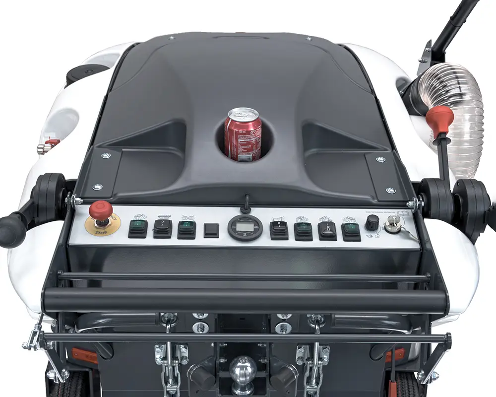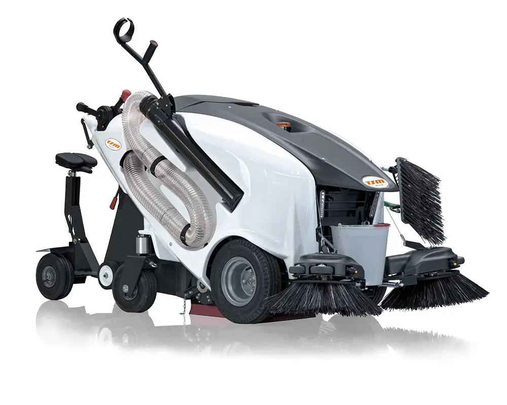 Es increíblemente versátil porque se puede utilizar tanto con operador caminando como a bordo, adicionando la carretilla, ofreciendo la posibilidad de ser conducida en tareas largas. También está equipada con una manguera de succión para recoger residuos voluminosos, y limpiar espacios estrechos, como macizos de flores, bancos laterales, etc.
